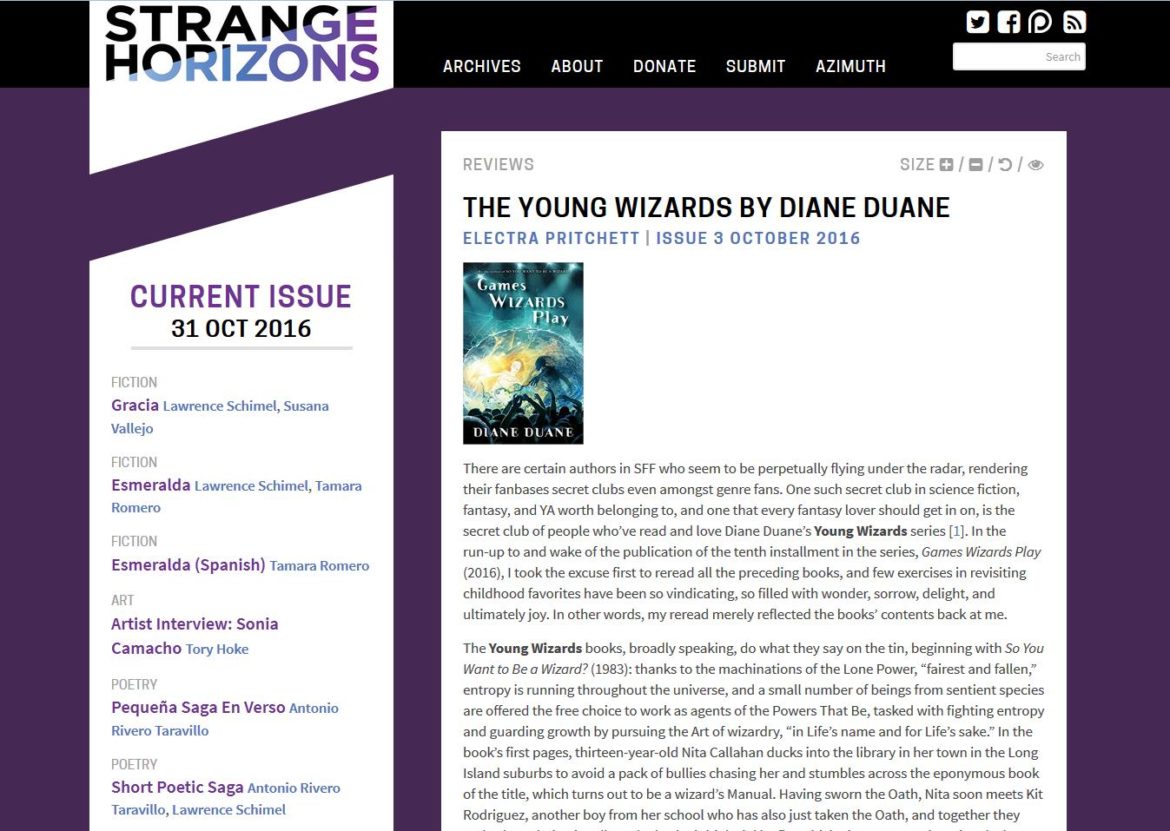 There are certain authors in SFF who seem to be perpetually flying under the radar, rendering their fanbases secret clubs even amongst genre fans. One such secret club in science fiction, fantasy, and YA worth belonging to, and one that every fantasy lover should get in on, is the secret club of people who’ve read and love Diane Duane’s Young Wizards series [1]. In the run-up to and wake of the publication of the tenth installment in the series, Games Wizards Play (2016), I took the excuse first to reread all the preceding books, and few exercises in revisiting childhood favorites have been so vindicating, so filled with wonder, sorrow, delight, and ultimately joy. In other words, my reread merely reflected the books’ contents back at me.