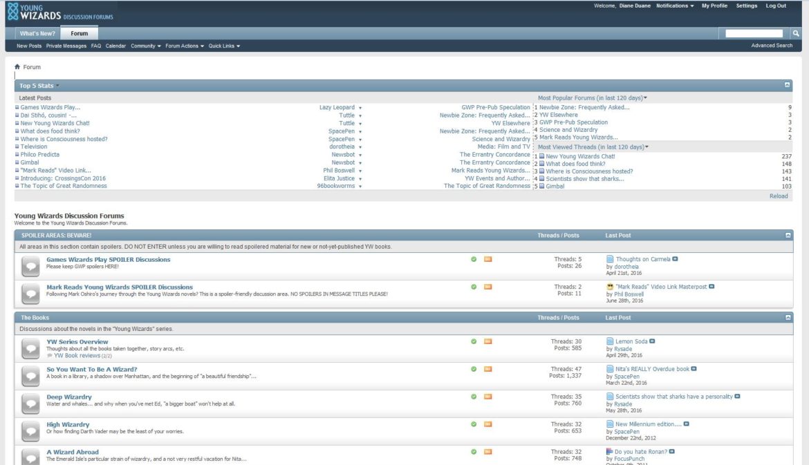 The Young Wizards Discussion Forums have been in existence since 2001. Originally hosted on the Groupee (later Eve) community engine / discussion board platform, they were migrated to a vBulletin installation in 2007. Diane Duane has routinely participated in the forum message boards since their opening.